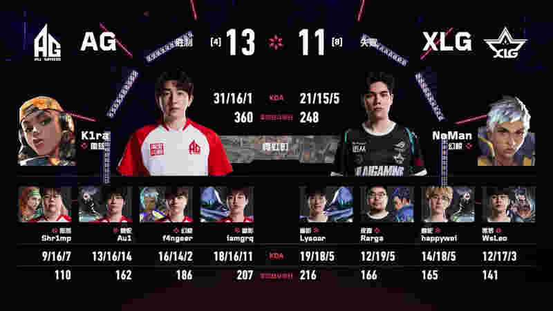 下半场,Rarga使用霓虹快速回防拿下四杀,XLG赢下手枪局。第15回合,happywei三杀并协同NoMan预判到AG转点,XLG再下一城。XLG连赢三分将比分拉开。第16回合AG经济局,他们通过快攻B点迅速建立人数优势,惊险翻盘。此后K1ra持续爆发,带领AG将比分追至10-10平。第21回合,K1ra虽被首杀,但AG在缺少烟位的情况下强行双拉进点,Au1与Shr1mp顶住压力,赢下二打四残局。AG最终打出一波8-0的超级攻势,以13-10拿下决胜图,总比分3-2战胜XLG,成功晋级圣地亚哥大师赛。