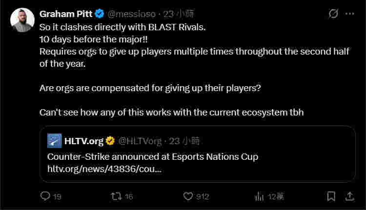 100 Thieves战队的CS阵容运营主管Graham Pitt一针见血地指出:“这直接和BLAST对抗赛冲突了,而且就在新加坡Major前10天,这意味着俱乐部下半年要多次放走自己的选手。”