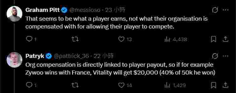 Vitality将获得2万美元(即他5万美元奖金的40%)。” 然而,Graham Pitt等人认为这笔金额与俱乐部可能承受的竞技风险及商业损失不成正比:“这看起来是选手赚到的部分,而不是俱乐部因允许选手参赛所获得的补偿,这点钱根本不够看。”