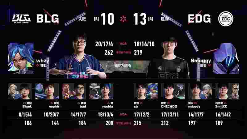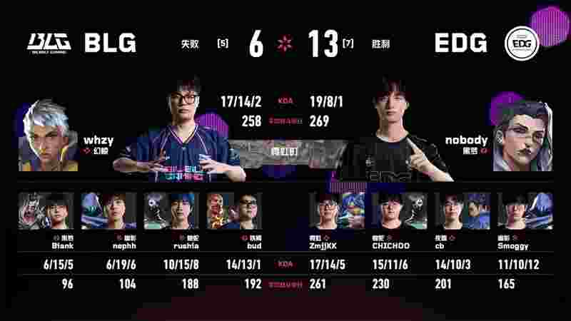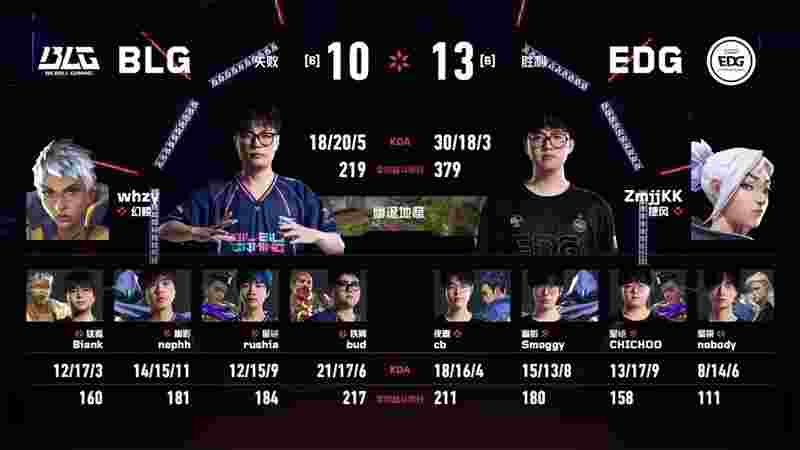 Zhong Jianfei (钟剑飞) | Biank使用正义在A点连杀三人,whzy绕后与bud在包点再收两人,BLG完成翻盘。第21回合,Smoggy在B包点几乎瞬间完成清场。EDG顶住压力,最终连下三分以13-10取胜,拿到赛点。