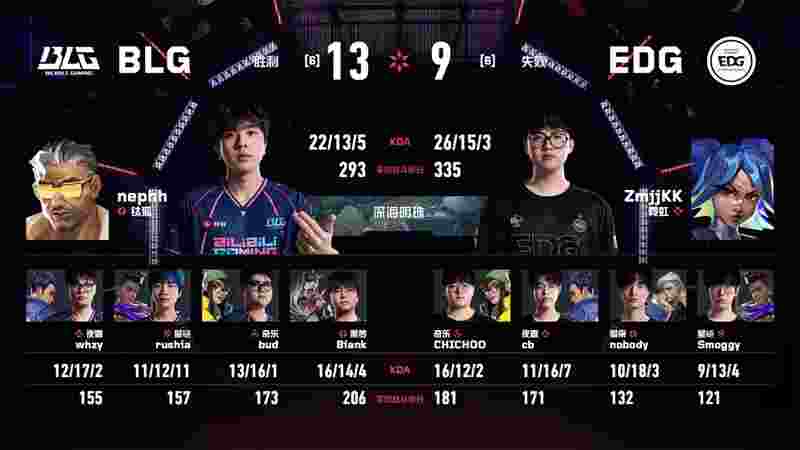 Zheng Yongkang (郑永康) | ZmjjKK在随后回合中打出四杀。BLG拿下奖励分后将比分扳平。第16回合,EDG在A点下出“世界包”,但被BLG回防强拆。此后EDG在经济局中通过中路控图获取信息,成功完成翻盘。然而BLG迅速调整,打出一波五连胜,以13-9拿下首图。
