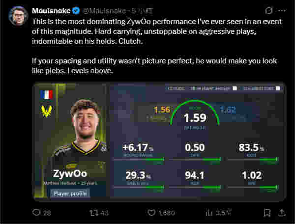 Mauisnake在社交媒体上写道:“这是我在如此规模的大型赛事中,所见过的最具统治力的ZywOo表现。他一人承载队伍、在激进打法上不可阻挡、在防守固守时坚不可摧,还能赢下关键残局。”