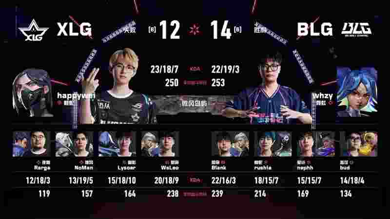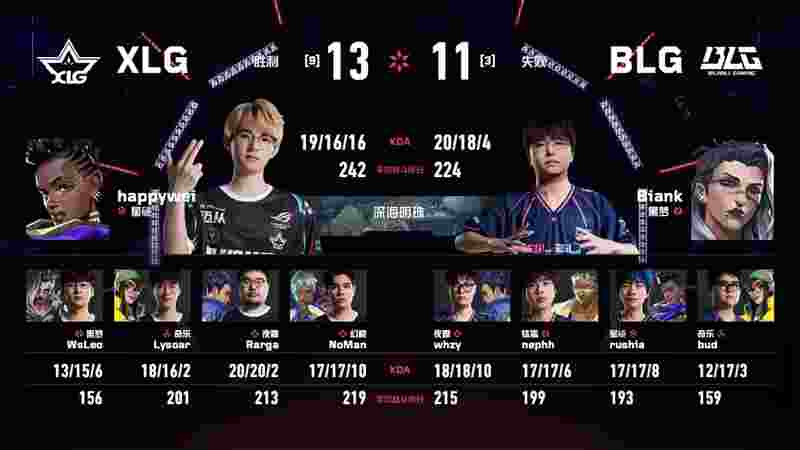 Deng Minwei (邓闵维) | happywei在包点直架完成四杀,帮助XLG稳住局势,上半场比分6-6。下半场BLG赢下手枪局,但XLG随即在奖励局发力,连续洞察BLG进攻意图,打出一波四连胜反超比分。关键时刻BLG再次展现韧性,whzy的进攻冥驹屡建奇功,连下三分将比赛再度拖入加时。加时赛中BLG连拿两分,以14-12取胜,总比分2-1领先。