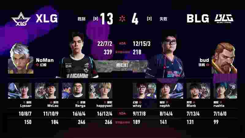 上半场BLG赢下手枪局后,whzy凭借守包三杀拿下奖励局。然而XLG的happywei持续发力,带领队伍在中后期打出得分高潮,以9-3结束上半场。下半场BLG展开绝地反击,一度将比分追至10-10平。关键时刻,Rarga在第21回合以一记180度拉枪撕开BLG的B点防守。随后两回合,XLG连续通过提速进攻攻破BLG重防的A点,以13-11取胜,将比赛拖入决胜图。