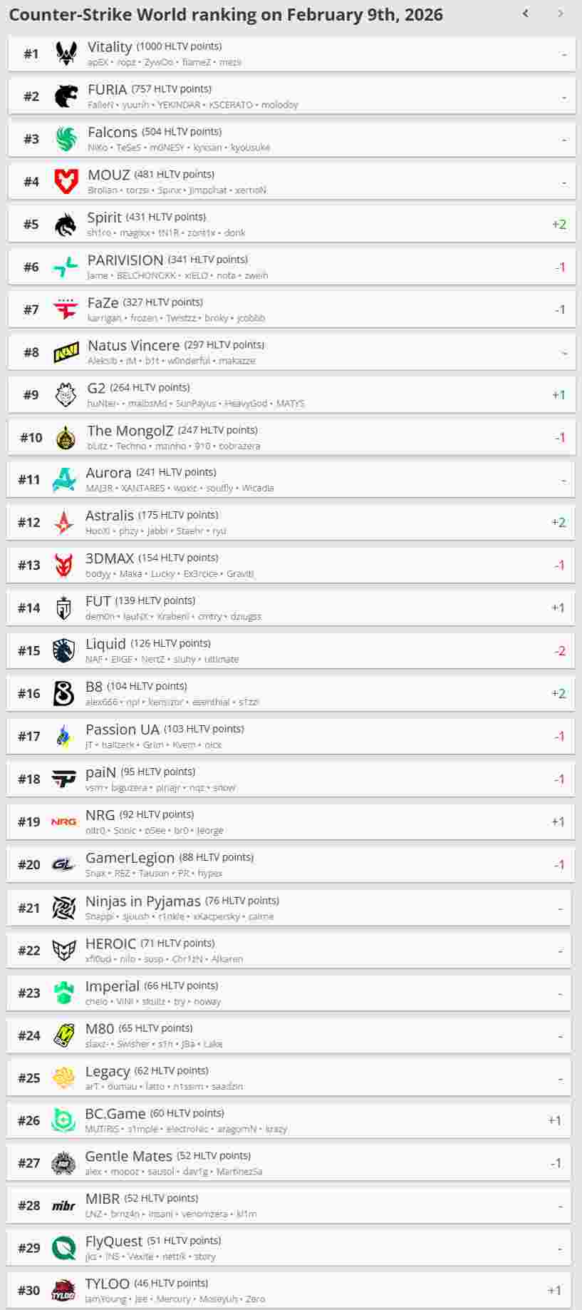 HLTV Top30战队如下: