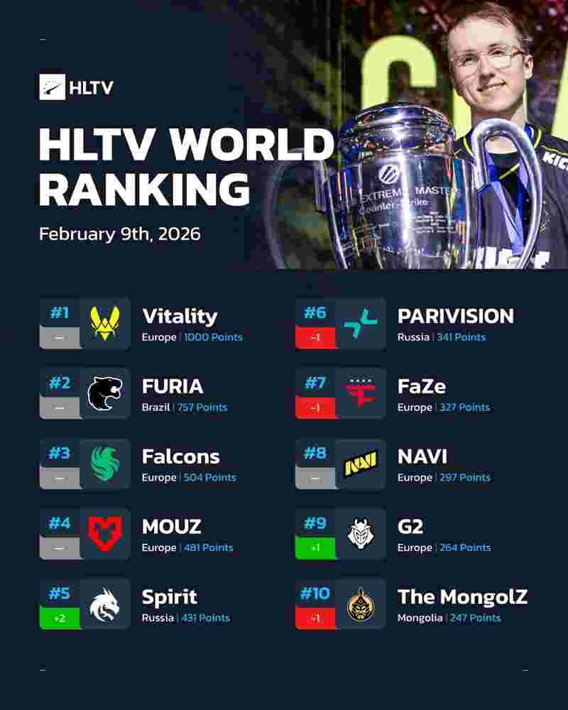 今天凌晨HLTV更新了最新一期世界排名。前十战队的整体格局依旧稳固,但内部位次因IEM克拉科夫 2026表现出现了关键变动。