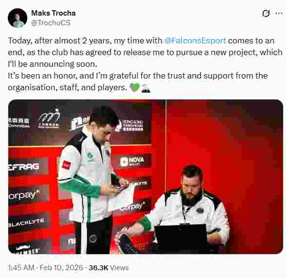 Falcons战队达成解约协议,这位波兰籍工作人员获准 “去开展新项目”,双方近两年的合作就此结束。