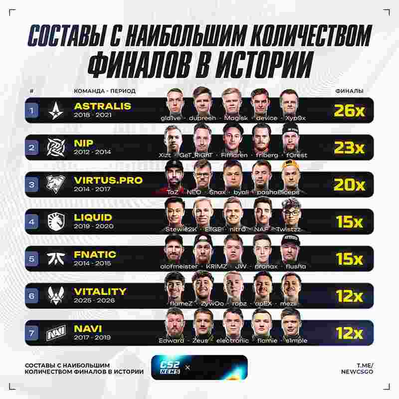 近日外媒统计了历史上各阵容闯入决赛的次数,Vitality现阵容成功进入榜单前七。