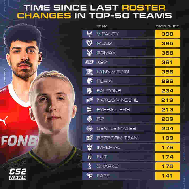 在CS2职业赛场,阵容调整往往被视为激活战绩的速效药。然而最新统计揭示了一个耐人寻味的现象:在全球前50名CS2战队中,仅有12支队伍在过去6个月内未进行任何阵容调整。在这12支“坚守者”中,法国豪门