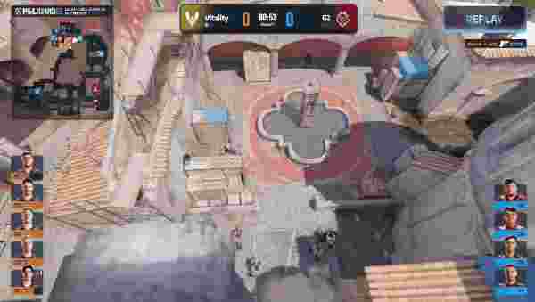 Vitality先做进攻方,手枪局G2重防A点,Vitality五人摸进香蕉道,突破包点CT三人后下包,击杀回防的二人,先拿下手枪局。