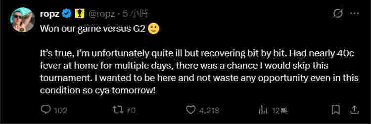 Vitality以2-1力克G2,拿下开门红。然而赛后引发热议的并非胜利本身,而是队内明星选手ropz的身体状况——这位爱沙尼亚步枪手在个人社交媒体上透露,自己过去几天持续高烧40度,险些无法出战本场比赛。