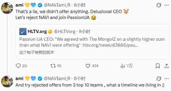 随后NaVi的电竞负责人aMi在X发布动态反驳了这位CEO的言论。
