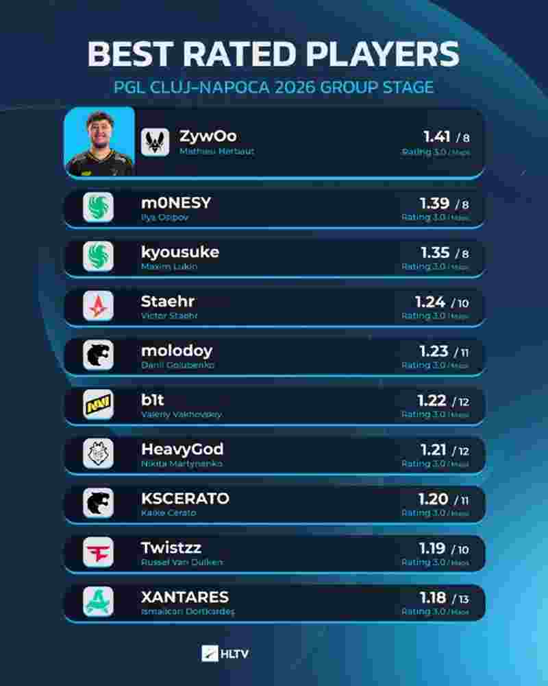 Vitality明星选手ZywOo在PGL克卢日-纳波卡2026小组赛阶段中,以1.41的Rating高居榜首。该数据由HLTV统计发布。