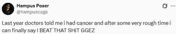 “去年医生告诉我,我得了癌症。经过一段非常艰难的时期,我终于可以宣布,我战胜了这该死的东西!现在我正在寻找一支战队。去年我无法在CS上投入足够的时间,但现在我非常有动力回归。