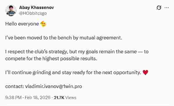 1win选手HObbit分享了自己被移出CS2阵容后的未来计划。他不打算退役,希望找到新战队。