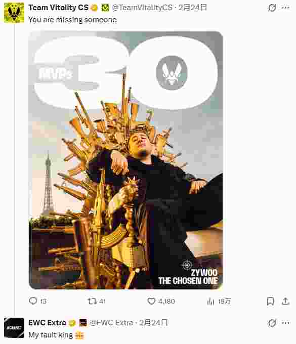 Vitality的CS官推在下方回复:你们忘了某个人