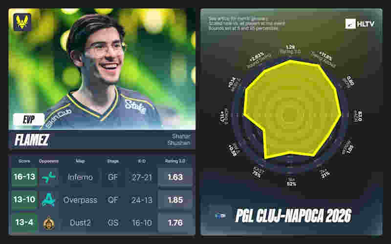 flameZ在罗马尼亚打出了职业生涯最佳表现,淘汰赛场均1.41 rating,总rating 1.29,获胜回合每回合击杀1.02。他在决赛中同样荣膺全场最佳,3-0横扫的胜利中砍下1.48 rating。