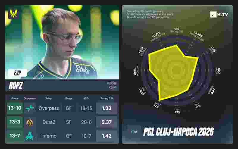 这位以色列突破手在队伍八场关键胜利中贡献1.36 rating。对阵Natus Vincere的Mirage决胜图,他下半场打出10-3、+18.1% Swing,彻底扼杀了对手的反扑希望。