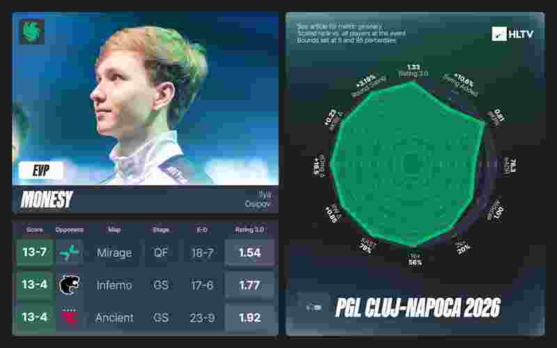 然而,他未能更进一步的原因在于:首先,小组赛地图胜利中,他得到了kyousuke和NiKo的大力支持(三人在这六张地图上rating均超1.35);其次,尽管1.19 rating结合其小组赛强势表现足以让他跻身EVP,但m0NESY在决胜图表现挣扎(0.97 rating),且在Dust2上从22-4的KD一度被追至26-16,稳定性方面还有待观察,这也使他最终只能位列EVP榜单中游。