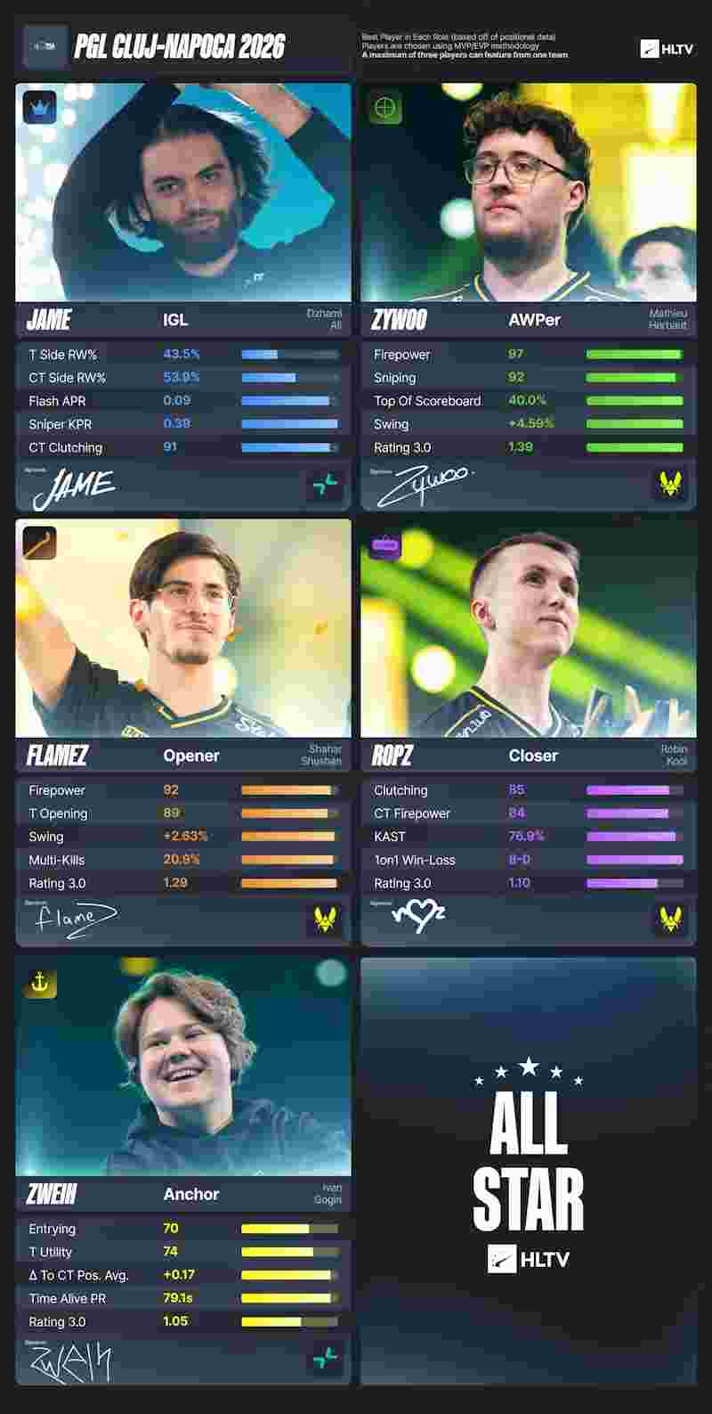 ZywOo与flameZ领衔全明星阵容,但他们的统治力意味着五人之阵中仅能为另一位Vitality选手留出一个名额。