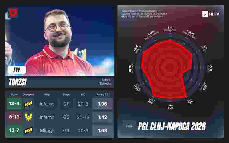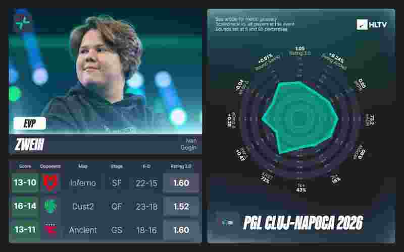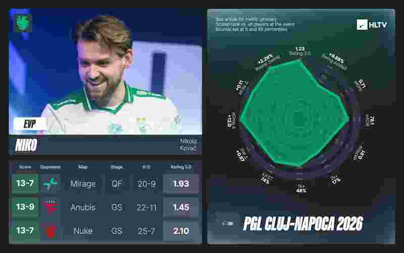 对阵PARIVISION的Mirage尤为惊艳——NiKo上半场轰出2.42 rating、154.2 ADR,直接将对手逼入决胜局。总体而言,他在赛场打出1.47 rating,从队内第三跃升至EVP行列。