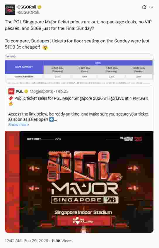 外媒CSGOROLL表示:“PGL新加坡Major票价出炉:无套票、无VIP通道,光是周日决赛就要369美元?