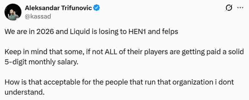 “现在是2026年,Liquid竟然输给了HEN1和felps带领的队伍。要知道他们队里有些人,甚至可能是所有人,每月拿着高达五位数的工资。我真搞不懂,运营这支队伍的管理层怎么能容忍这种事情发生。”