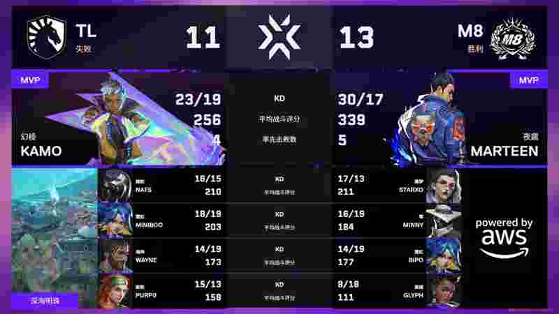 Conner Garcia | GLYPH关键枪接住对方霓虹,M8顺势拿下奖励局。第5回合,marteen上演冷静操作,拿下击杀后利用传送TP至A点,凭借神奇时机赢下1v3残局。比分一路来到8-0,TL一分未得。第9回合,nAts在蝰腹中顶住压力拿下双杀,kamo架住过点,TL终于拿下图二第一分。第11回合,wayne突然爆发,顶住A小三人后转至B点拿下四杀,为TL再追一分。上半场M8以10-2遥遥领先。