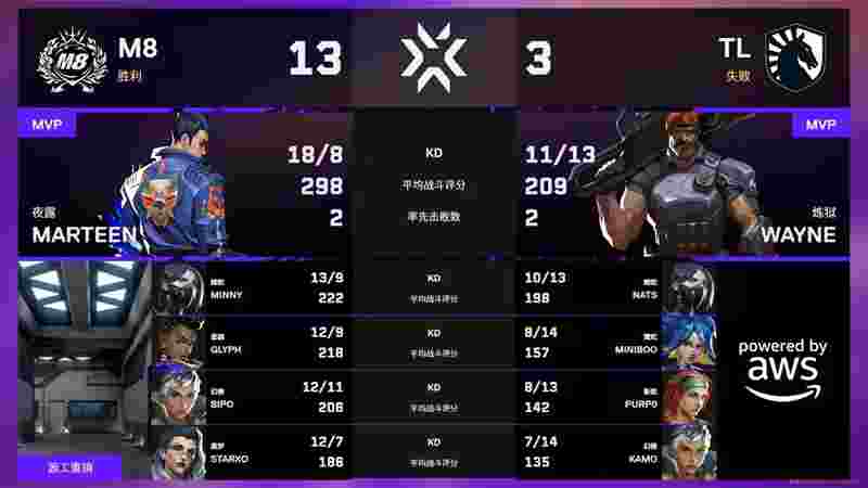 下半场TL拿下手枪局,但随后的ECO局被M8完成翻盘。M8一波3-0的直接攻势将比分定格在13-3,轻松拿下图二,总比分2-0战胜TL,成功晋级淘汰赛。