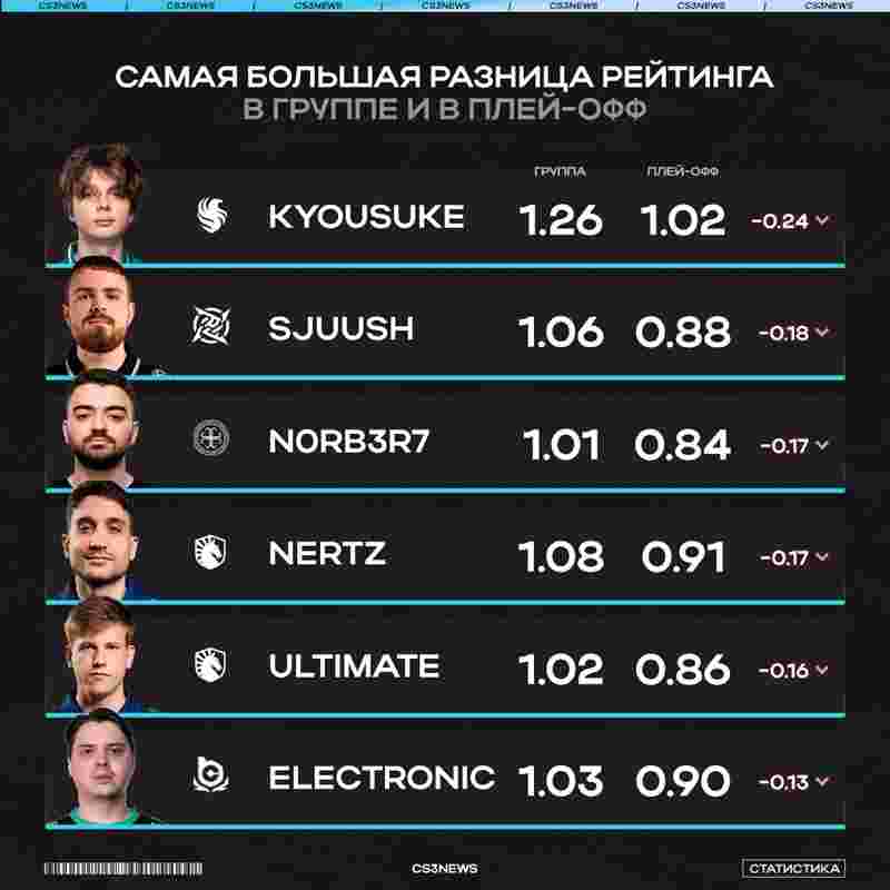 近日外媒CS3NEWS统计了从小组赛到淘汰赛数据下滑最严重的前五名选手。