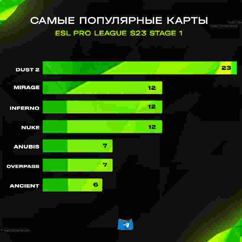 根据数据统计,Dust2依旧是最受大家喜爱的地图,在EPL S23第一阶段期间一共进行了23场该地图的比赛,紧随其后的是Mirage、Inferno和Nuke,这三张地图均进行了12次比赛。