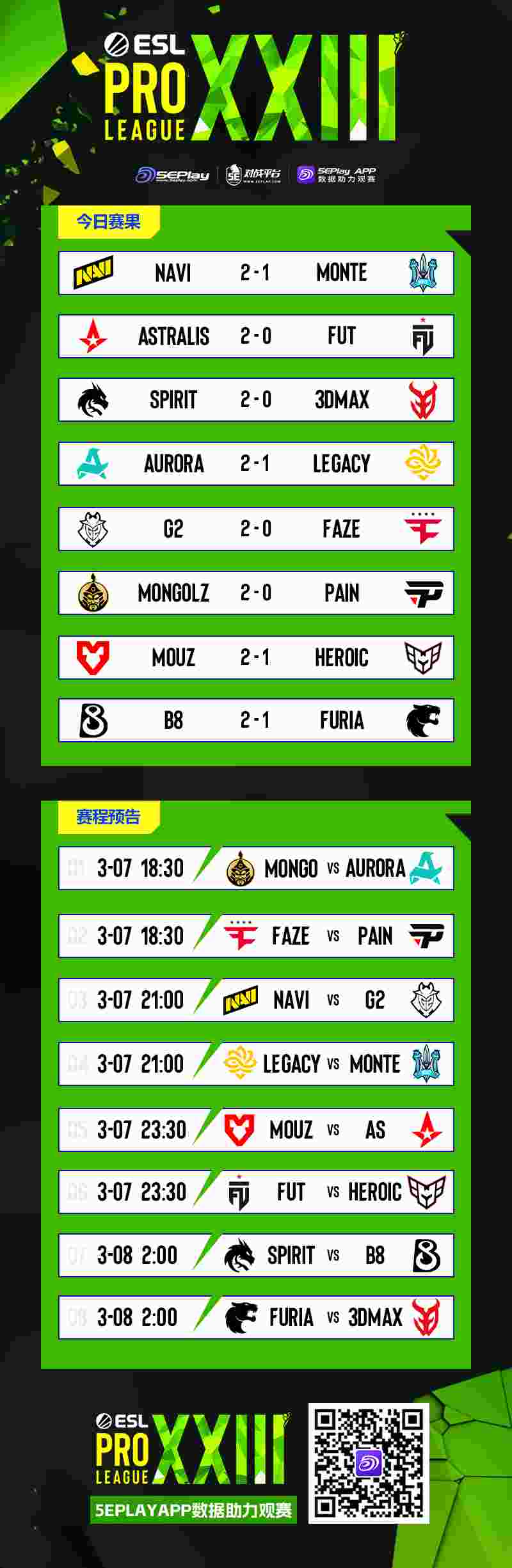 paiN。NAVI再遇PGL克卢日-纳波卡的手下败将G2,Spirit迎来刚战胜FURIA势头正盛的B8。而状态明显不佳的FURIA,将在败者组迎战3DMAX。
