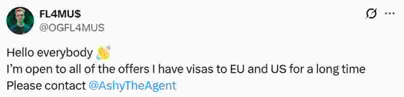 OG战队选手FL4MUS宣布正在寻找新队伍。这位电竞选手表示自己可以参加欧洲和美国的赛事,并通过个人X平台主页发布了这一消息。