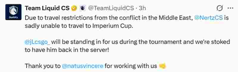 “由于中东冲突导致的出行限制,NertZ遗憾无法参加罗马帝国之声杯。赛事期间jL将代表我们出战,我们非常高兴能再次在游戏中见到他的身影。感谢