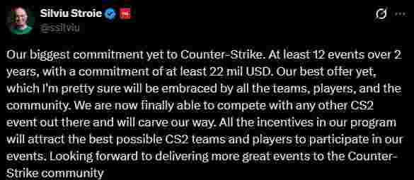 “这是我们迄今为止对CS最大规模的投资。两年内至少举办12场赛事,投资额不低于2200万美元。这是我们能提供的最佳方案,我相信所有战队、选手和社区都会对此反响良好。现在我们终于有能力与任何其他CS2赛事竞争了,我们将开辟自己的道路。我们项目中的所有奖金都将吸引最顶尖的CS2战队和选手来参与我们的赛事。我们迫不及待地期待为CS社区举办更多精彩的赛事。”