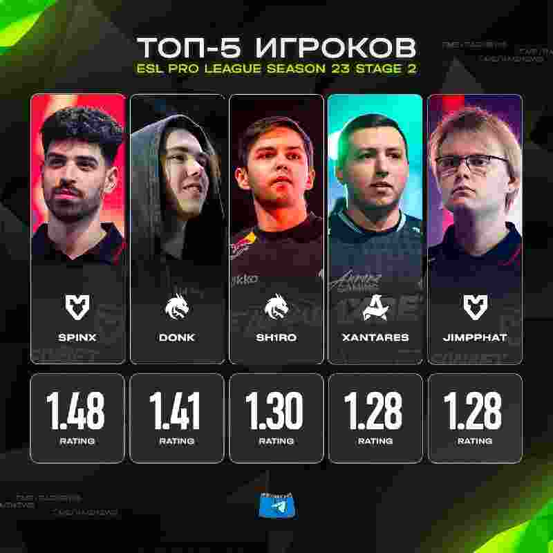 Spirit,各有两名选手进入榜单TOP5。其中Spinx以1.48的rating位列榜首,排名第二的donk数据为1.41。sh1ro以1.30紧随其后,