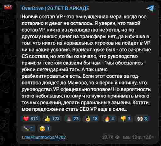 “VP的新阵容是一种无奈之举,是在走投无路且资金耗尽的情况下被迫采取的措施。我相信管理层没有人想要这样的阵容,但别无选择:既没有资金用于引援,关键在于,也不会有任何像样的选手愿意以任何条件加入VP。