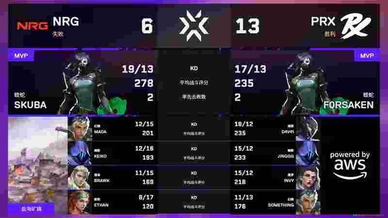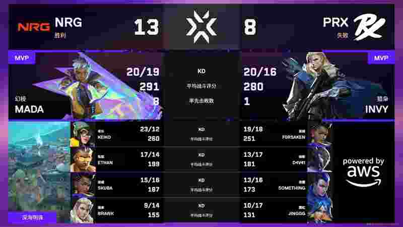 Adam Pampuch | mada一旦被击杀,NRG进攻便陷入被动。第6回合,mada的进攻冥驹拿到首杀,NRG直接rush B点,skuba蝰蛇开大,瞬间瓦解PRX防守。第8回合,PRX经济局抢A前点,mada冥驹被打掉,NRG进点后被PRX包夹在包点,PRX完成翻盘。第11回合,mada单人控中打掉something,NRG其余四人于A点逐步推进,依靠对枪质量拿到人数优势赢下。上半场NRG因阵容与指挥问题稍显劣势,以5-7落后。