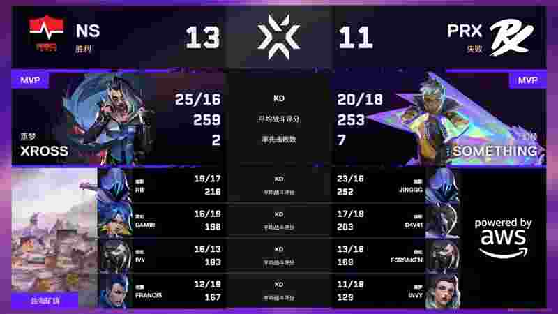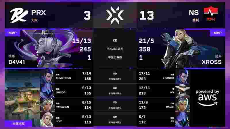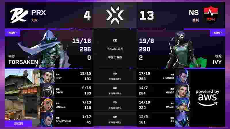 进入下半场,NS继续主导比赛节奏,Ivy在第15回合更是斩获ACE。NS下半场仅输掉一分,一举拿下PRX的强图霓虹町,大比分2-0领先。