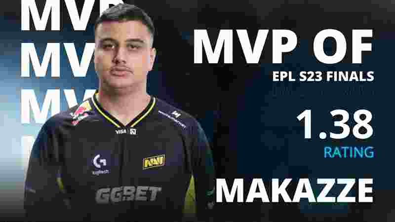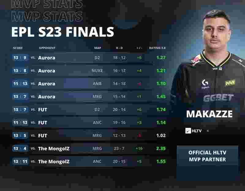 在EPL S23淘汰赛期间,makazze一共随队出战了三场比赛9张地图,打出了平均1.38的超高Rating。其中,在1/4决赛对阵
