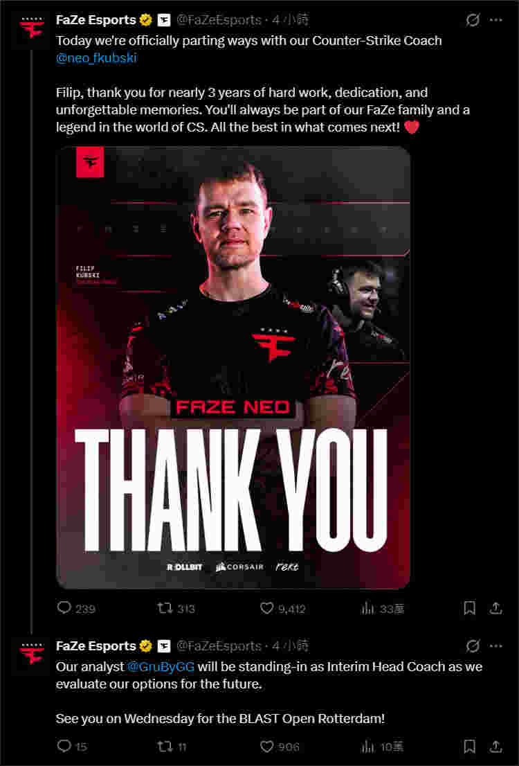 FaZe官方今天正式宣布与主教练NEO结束合作,这位传奇波兰选手自2023年7月RobbaN卸任后接手FaZe教鞭,双方近三年的合作就此画上句号。