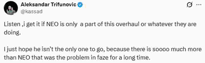 与此同时,kassad强调了FaZe未来阵容调整的重要性:“听着,如果NEO的离队仅仅是FaZe大规模阵容调整的一部分,那我就能理解这个决定。我希望他不是唯一一个离开战队的人,因为问题显然不仅仅出在他身上。”