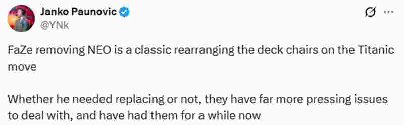 YNk:“FaZe决定解雇NEO,这是典型的‘泰坦尼克号上调整躺椅’——该死还得死。无论是否需要更换教练,这支队伍都存在着更为紧迫的问题,而且这些问题已经持续相当长一段时间了。”