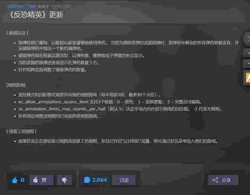 3月19日早晨,Valve推出了CS2更新,该更新重做了武器换弹机制,使用弹匣供弹的武器进行换弹时,当前弹匣中所有剩余弹药将被丢弃,并从备用弹药中更换全新满弹匣。详情点击>>