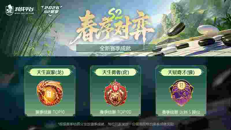 本次赛季结算时达到天梯 TOP10、TOP100 与 S段位 的玩家将可以获得天生赢家(龙)、天选勇者(虎)与天赋奇才(狼)三款赛季荣誉成就,表彰在天梯上取得卓越成就的玩家们!