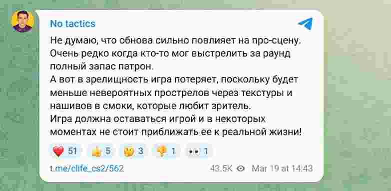 除此之外,Spirit的分析师clife则是批评了CS2最新更新。他认为,换弹机制的改动会让职业比赛失去观赏性。