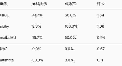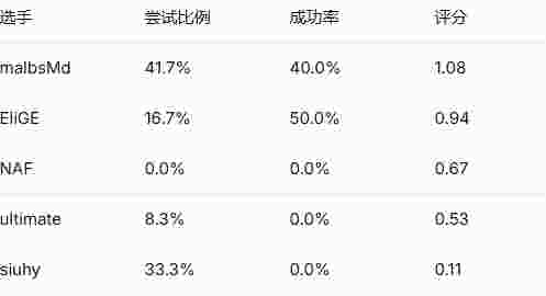 EliGE在进攻方承担了超过40%的首杀尝试,而malbsMd以16.7%位居第二。当然,这仅仅是12个回合的极小样本量,这些数据最终会趋于正常化。我猜测siuhy未来也会分担更多的首杀尝试,而malbsMd的比例长期来看可能会稳定在20%左右。