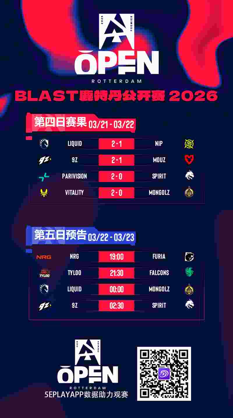 BLAST鹿特丹公开赛2026第四日比赛落下帷幕,在第四日比赛前两场回家局中