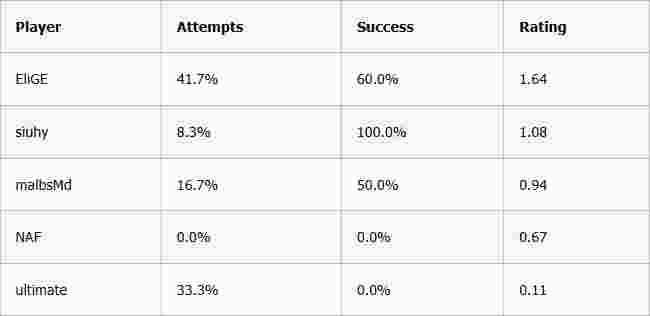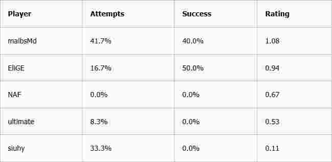 EliGE在T方贡献了超过40%的首杀尝试,malbsMd以16.7%位居第二。当然,这只是12个回合的极小样本,数据必然会在后续趋于正常化。我猜测未来siuhy也会分担更多首杀尝试,而malbsMd的长远占比可能在20%左右。