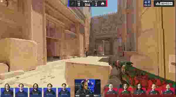 第一场,PV先做进攻方,手枪局四人从摸进河道,从黑屋进B,和B门同时进攻,donk虽然拿下首杀,但PV精准防住了背后河道回防的CT,PV取得先机。